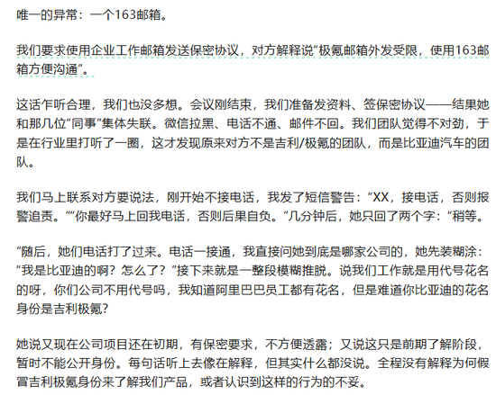 但在沟通结束后,推文作者对对方使用的163后缀邮箱产生怀疑,并试图再次与对方联系时,收到回复称“我是比亚迪的啊?怎么了?”且对方称该公司项目还在初期,有保密要求,不方便透露,目前仅为前期了解阶段,暂时不能公开身份。