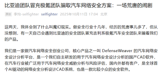 10月11日,一条名为《比亚迪团队冒充极氪团队骗取汽车网络安全方案:一场荒唐的闹剧》的推文在互联网上传播。